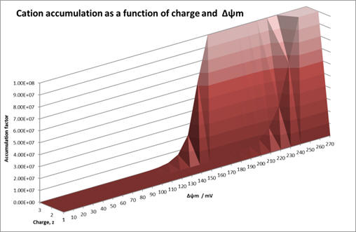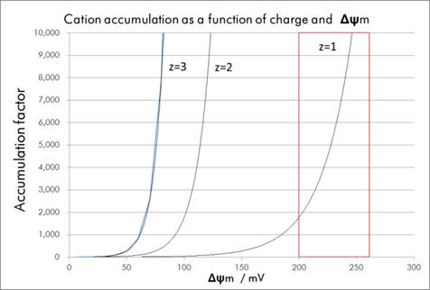 Graph 1 shows how accumulation varies across a range of Δψm (ie., physiological and mitochondrial membranes) for variously charged cations.