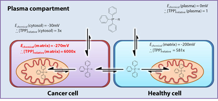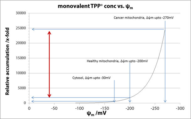 For monocations, the exponent in Equation 5 dictates a ca. ten-fold cation accumulation per 61.5mV difference. [39] Thus relative to the plasma the healthy mitochondria (-200mV) result in a several hundred-fold accumulate [40,41], and cancer mitochondria relative to plasma, at least an order of magnitude greater. [42,43] The selectivity depends upon the differences in membrane potentials and for a monocation the selectivity is 10-40x. See Figure 6 for a comparison of compartmental cation accumulation.