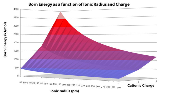 Born energy as a function of charge and radius (Graph 4) clearly illustrates the decreasing demand of desolvation with increasing radius and the enormously increasing demand with charge: large ions of low charge are most easily desolvated, whereas small ions, like metals are desolvated with difficulty. [50]
