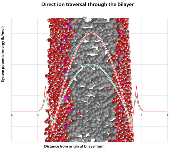 Once desolvated the ion is pulled through the membrane surface and into the core and as it goes, the Born energy varies (see Graph 5). The local maxima correspond to cation partial desolvation on approach to the membrane. The troughs correspond to stabilising interactions between the with the membrane lipid anionic phosphate (see Figure 9). This suggests there may be a propensity for monolayer adhesion of TPPs to the membrane surface which may contribute to the anti-cancer effect through membrane function modulation. The potential energy rapidly rises towards the membrane core due to increasingly unfavourable interactions due to a drop in permittivity, see Figure 8. [53]
