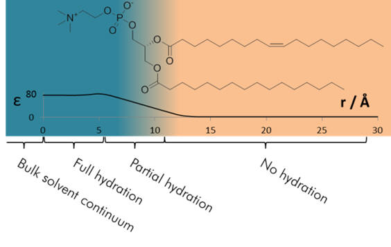 Typical cations are strongly solvated and form solvation complexes (see Figure 7). Before membrane traversal can proceed total desolvation is required and this is highly endogonic involving loss of stabilising solvent interactions. The energy demand of desolvation can be estimated using the Born model which treats ions as point charges and the bulk solvent as a dielectric continuum. [48] The cations interact with the electric fields of the solvent molecules and these interactions constitute solvation. Thus the Born energy is a measure of solvation and is calculated using Equation 6. [49] The function has three variables, the charge (z), the solvent-adduct radius (r) and the dielectric (ε) of the solvent. For a discussion of electric permittivity see Appendix.